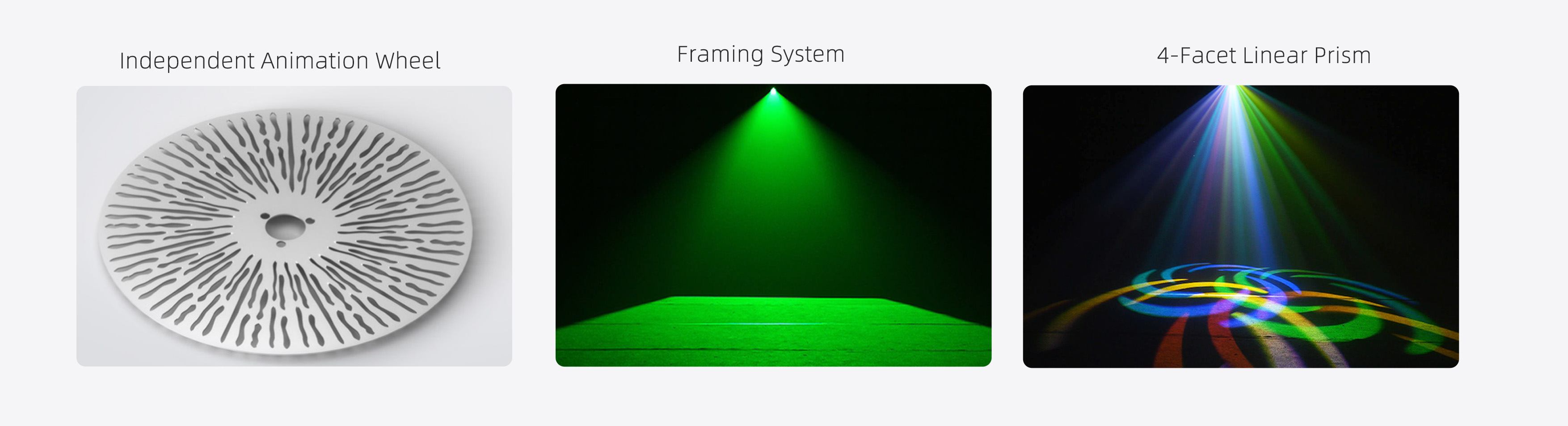 • Rotating gobo wheel: 6 pluggable glass gobos, each gobo can rotate independently in both directions