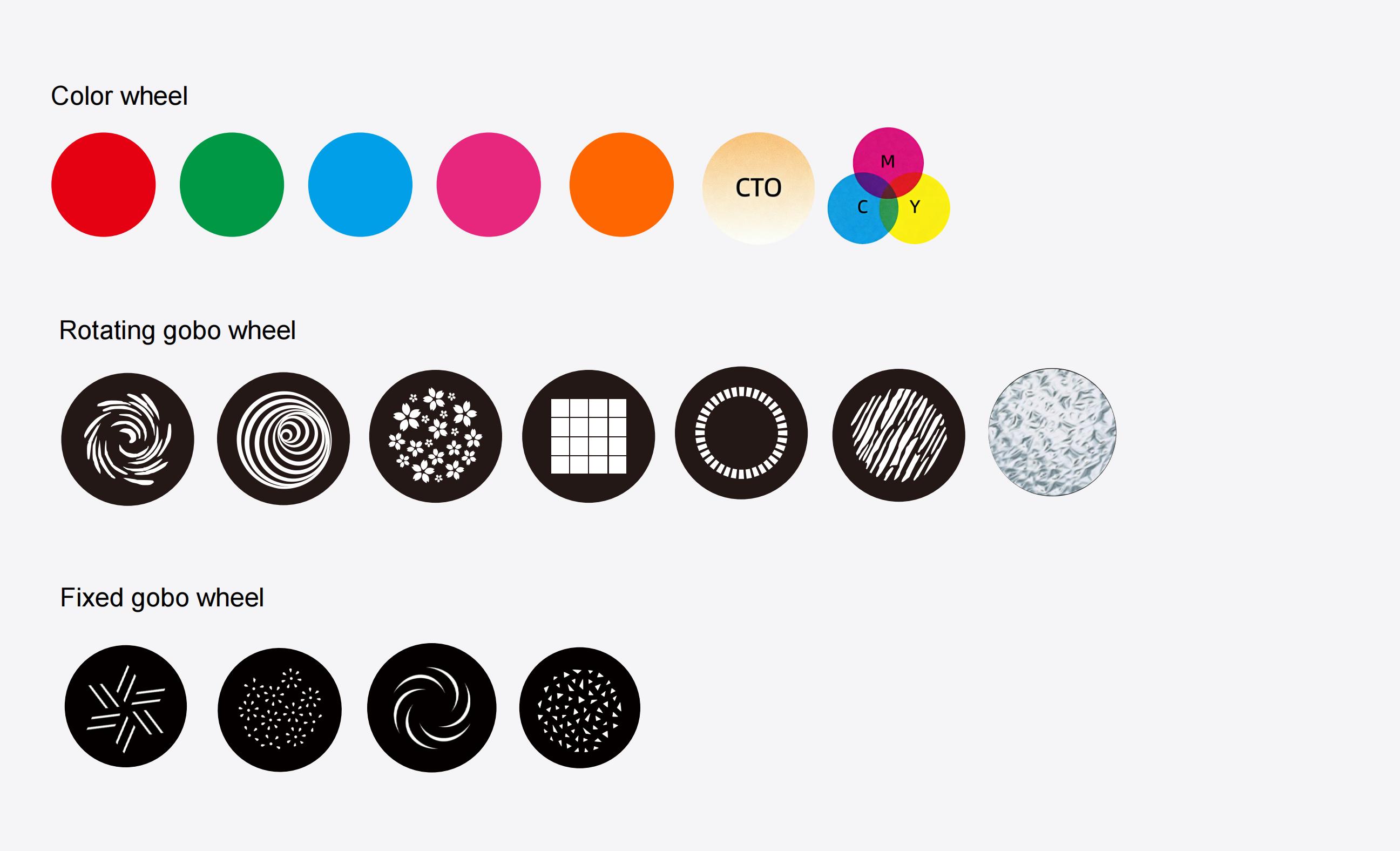 • Rotating gobo wheel: 7 pluggable glass gobos, each gobo can rotate independently in both directions