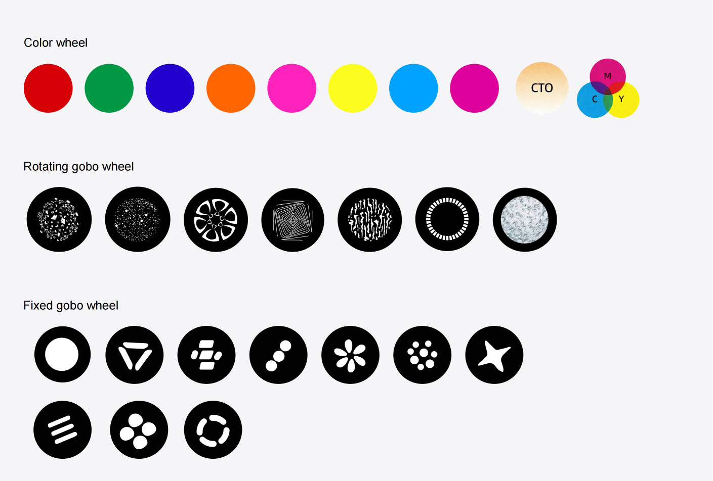 • Fixed gobo wheel: 10 fixed gobos+white, which can change speed and shake
